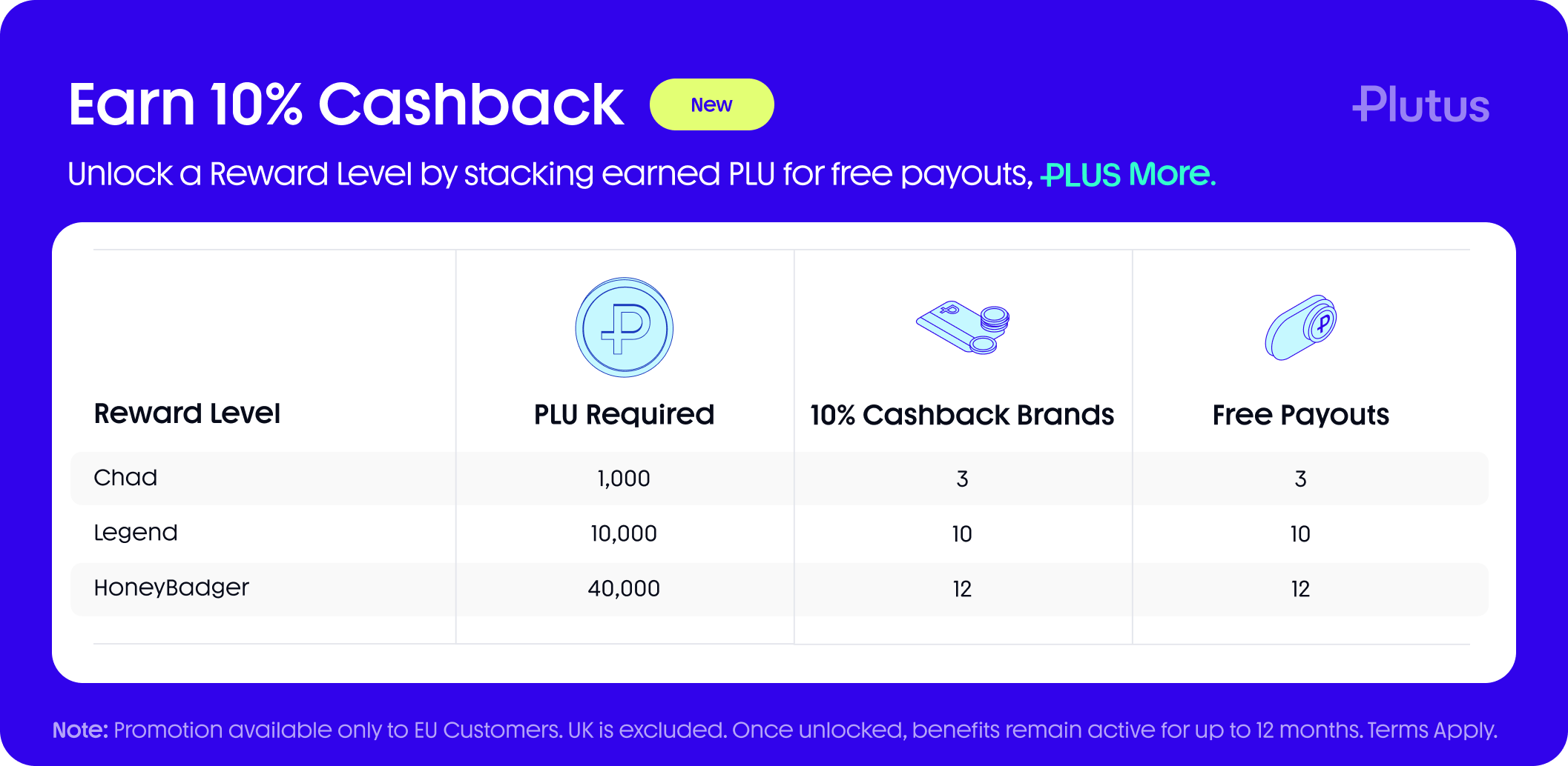 - Earn €1 back for every €10 spent with your Plutus card (that’s 10% cashback, max €1 cashback per transaction)